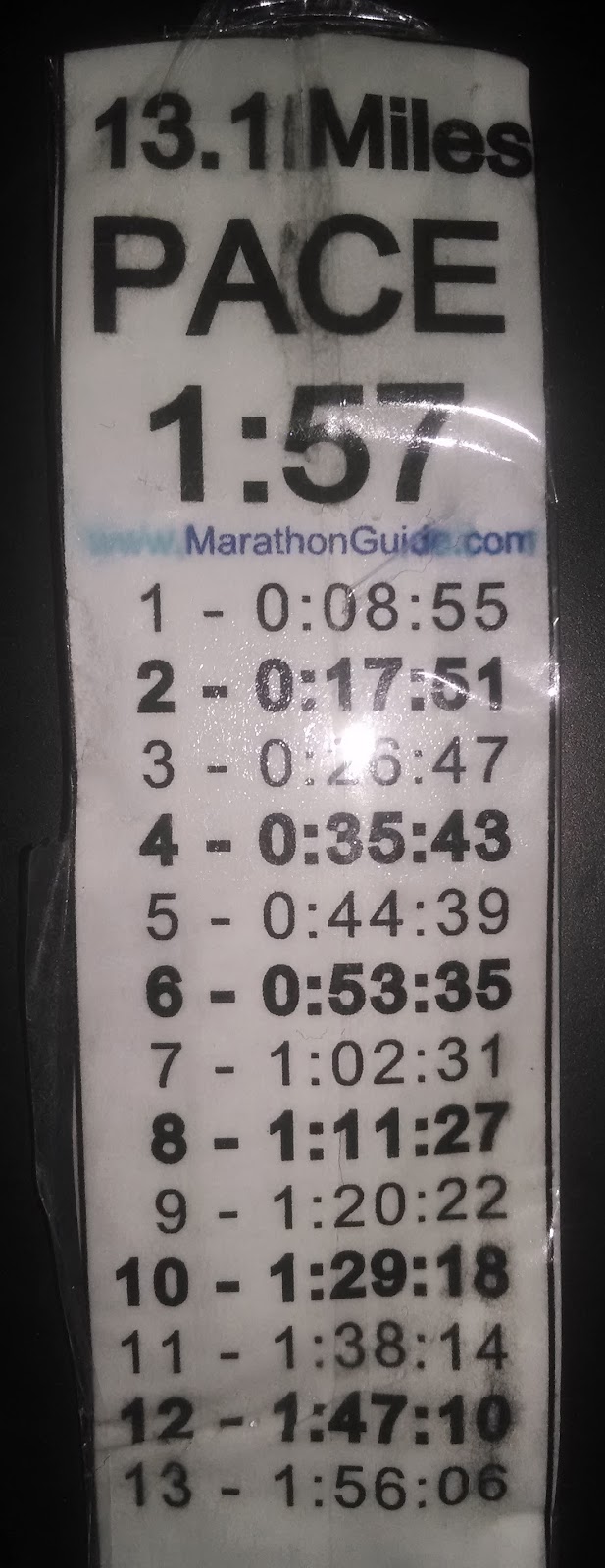 How did I know I was on-track? I had a paceband. What’s a paceband? It’s that thing right there! I found a site, I plugged in the time I wanted to finish in, and told it the distance I was running. It did the math and put it together into a wristband that said at what time I needed to be at each mile marker. I printed it out, cut it out, and…”laminated” it…with some scotch tape. For the first 8 miles I was 2 minutes ahead of target. After that I started to slow a bit, but I was on-track. I knew for a fact that I could do it. It also allowed me to make smart, informed, tactical decisions about “walk-breaks”…10 seconds of walking here and there helped me keep my overall pace up. I DEFINITELY recommend printing up one of these for your next race. Solid idea for sure.