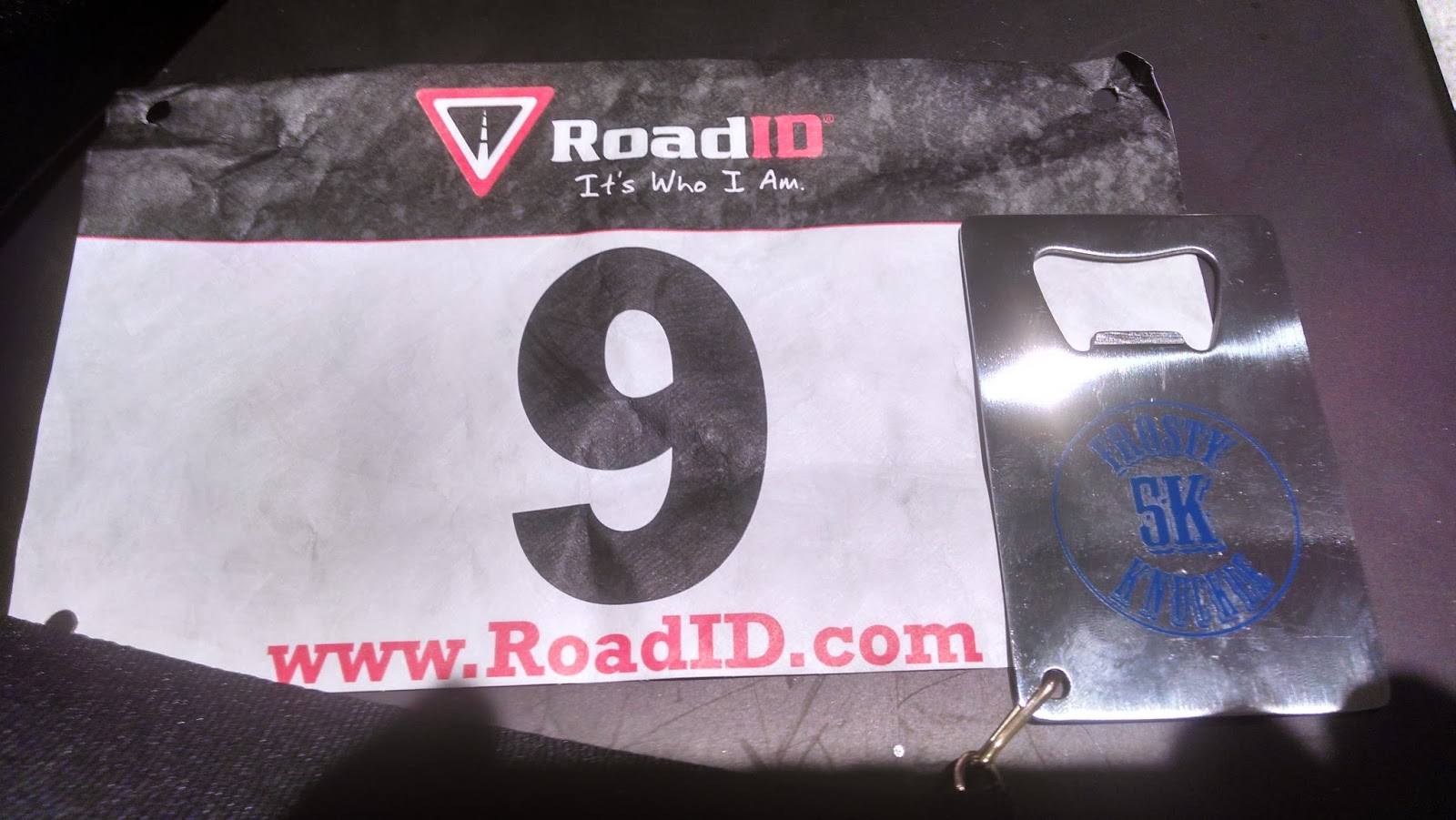 I ended up doing pretty well all things considered. The race was a little over a 5K (3.3 miles) and I finished in 26:59, which is about 8:11 min/mile. I was pretty satisfied with that, especially considering I intentionally tried to slow myself down starting somewhere late in the 1st mile. What really caught me off-guard was when the race director Heidi started announcing age group awards…and got to the Male 19 – 29 age group…and announced me as 3rd place! My Mom (who was there) can tell you…the look on my face must’ve been hysterical – I was NOT at ALL expecting that. The medal itself was pretty hilarious, but appropriate considering Frosty Knuckle is actually a beer (Google it).